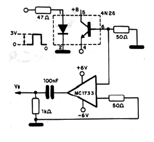 Este circuito es sugerido por Motorola, usando un acoplador del tipo 4N26 y un operacional del tipo MC1733. Sin embargo, la configuración se puede experimentar con componente equivalente. Con esta configuración los tiempos de conmutación se pueden reducir de 2 a 3 us a 100 ns típicamente. El amplificador operacional debe recibir alimentación simétrica y la señal de entrada debe ser rectangular con una amplitud de 3 V. Para este tipo de señal, la salida sube del 10% al 90% de 0,6 V en aproximadamente 100 n.