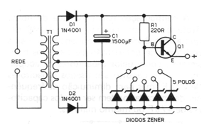 Nada más útil en la bancada que una fuente de tensión variable. Esta es la fuente que encontramos en la documentación de 1983. Tenemos una fuente variable en la que se utilizan diversos diodos zener.seleccionables por una llave de 1 polo x 5 posiciones. Cada diodo corresponde a una tensión que el lector desee en la salida, según el tipo de trabajo a realizar. El transformador elegido debe tener tensión de acuerdo con el máximo deseado en la salida. Para una tensión de 9 V se utiliza un transformador de 9-0-9V con corriente de hasta 1A, y para una tensión máxima de 12V, un transformador de 12-0-12V con igual corriente. El transistor puede ser cualquiera de los siguientes tipos: BD135, BD137, BD139, TIP31, TIP41 o 2N3055. Este componente debe montarse en un disipador de calor. Es importante observar que el diodo zener debe tener una tensión aproximadamente 0,6 V mayor que el valor deseado en la salida, ya que existe una caída de este orden en el transistor. Para que no se produzcan zumbidos en los aparatos de audio alimentados, el filtrado debe ser bueno, recomendándose un capacitor electrolítico de al menos 1500 uF.