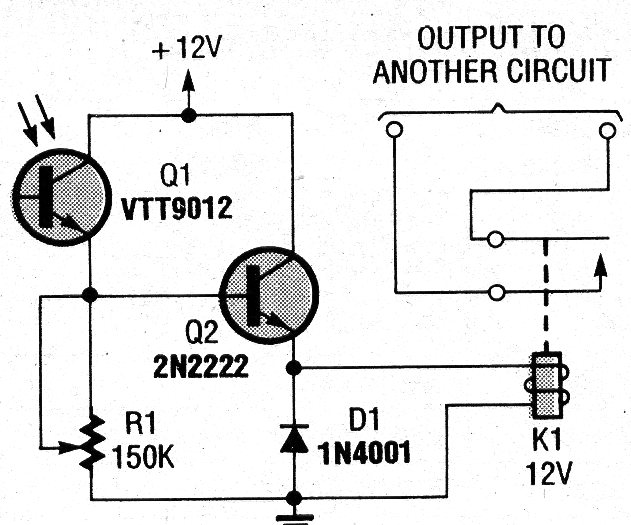 Cuando el sensor, un foto-transistor común, recibe luz, el relé cierra sus contactos. El circuito puede ser alimentado con 6 o 12 V, dependiendo del relé y la sensibilidad se ajusta en R1. El circuito es de una Poptronics de 1993.