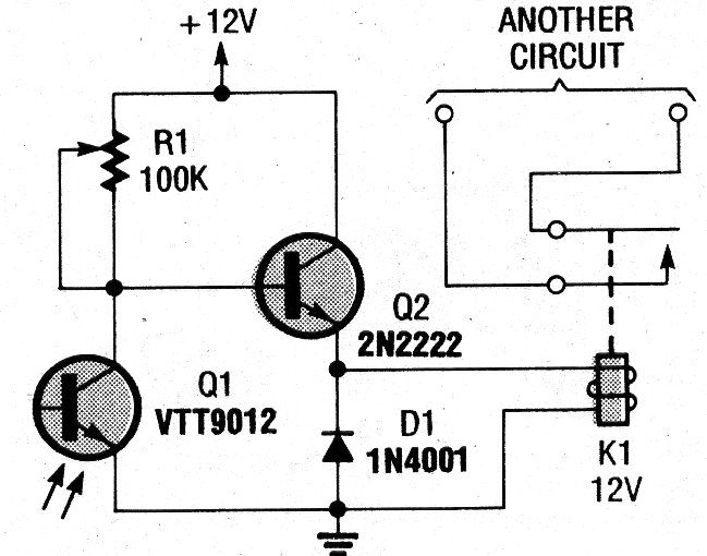 Cuando la luz deja de incidir sobre el sensor, un foto-transistor común, el relé cierra sus contactos. El circuito tiene su sensibilidad ajustada en R1 y puede ser alimentado por tensiones de 6 a 12 V según el relé. Encontramos esta configuración en una publicación americana de los años 90.