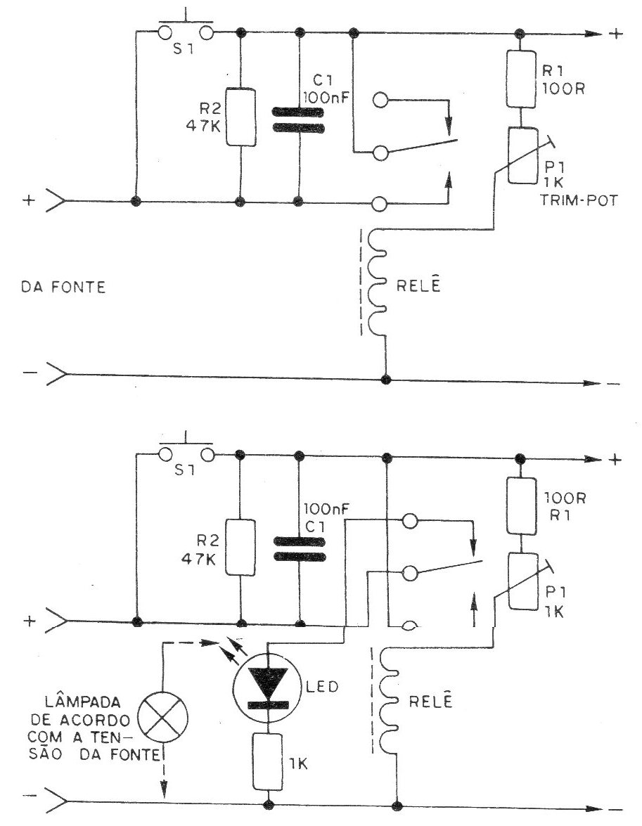 Este circuito es de gran utilidad para el experimentador que puede tener su fuente de alimentación dañada en caso de cortocircuito en el aparato que está recibiendo su energía. Lo que tenemos es un relé que se ajusta para abrir sus contactos en caso de caída excesiva de tensión, apagando así la fuente. Como la caída excesiva de tensión ocurre en caso de cortocircuitos o de una corriente de carga mayor de la que la fuente puede proporcionar, tenemos la protección deseada. El relé usado debe tener una tensión muy inferior a la de la fuente y operar con una corriente pequeña. Sugerimos la utilización de un relé de 6 V x 50 mA, siendo el trimpot entonces ajustado para hacerlo recibir esta tensión solamente cuando la fuente está en funcionamiento normal. Este trimpot debe entonces ser de 1 k teniendo una resistencia de 100 ohms conectados en serie. Con este potenciómetro, el Circuito de protección se puede utilizar en fuentes de 9 V a 18 V. Para fuentes de 6 V, el relé utilizado debe cerrar sus contactos con al menos 4,5 V, para obtener un correcto ajuste en el trimpot. R1 y C1 hacen la protección contra el contacto en los contactos, y S1, un interruptor de presión, rearma la fuente, es decir, la enciende de nuevo después de que la causa del corto es descubierta y removida. El circuito adicional permite que se añada una lámpara o un indicador LED rojo que se encender cuando el relé se desarmar en caso de cortocircuito.