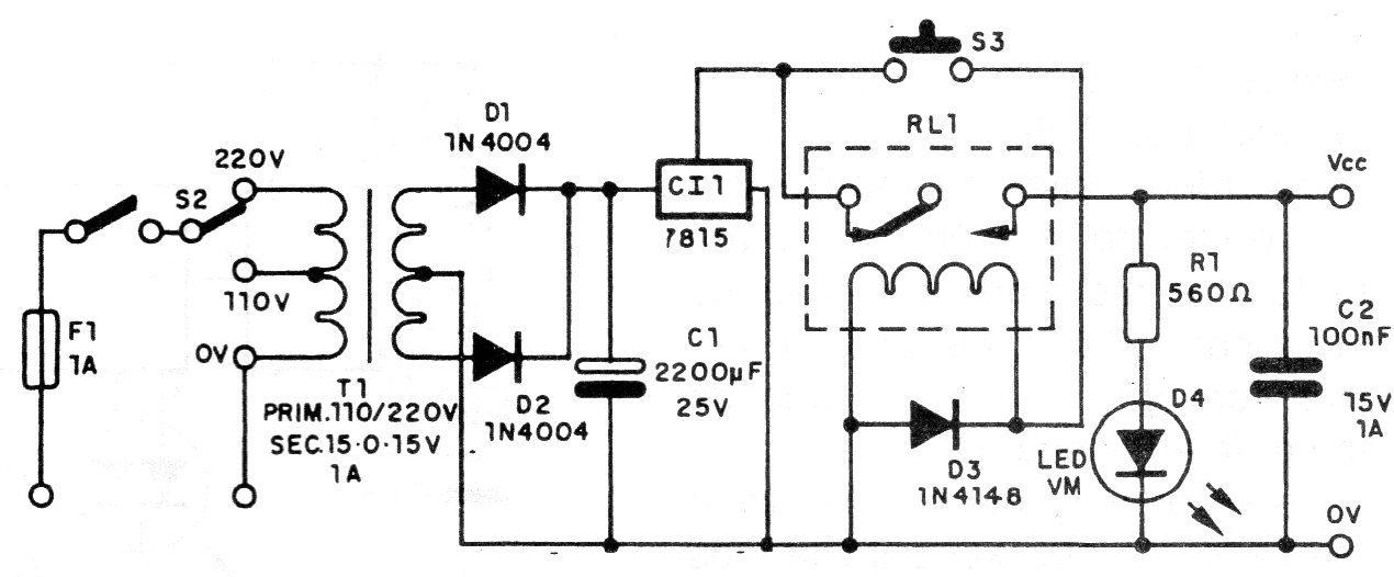 En caso de corto en la salida el relé desarma interrumpiendo la alimentación. Para rearmar esta fuente, basta presionar por un instante el interruptor S1. El circuito es de una documentación de 1995. Si se utiliza un relé de 12 V y el CI 7812, la fuente puede proporcionar esta tensión.