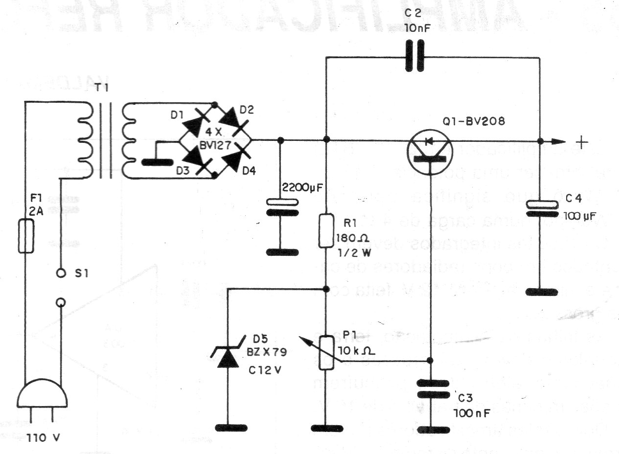 Esta fuente utiliza un transformador de 12 + 12 V con 10 A y el transistor de potencia debe estar dotado de un excelente disipador de calor. Los diodos son para 10 A con tensión inversa de al menos 50 V y el zener determina la tensión de salida que se puede ajustar en P1. Los electrolíticos tienen tensión de trabajo de al menos 12 V.