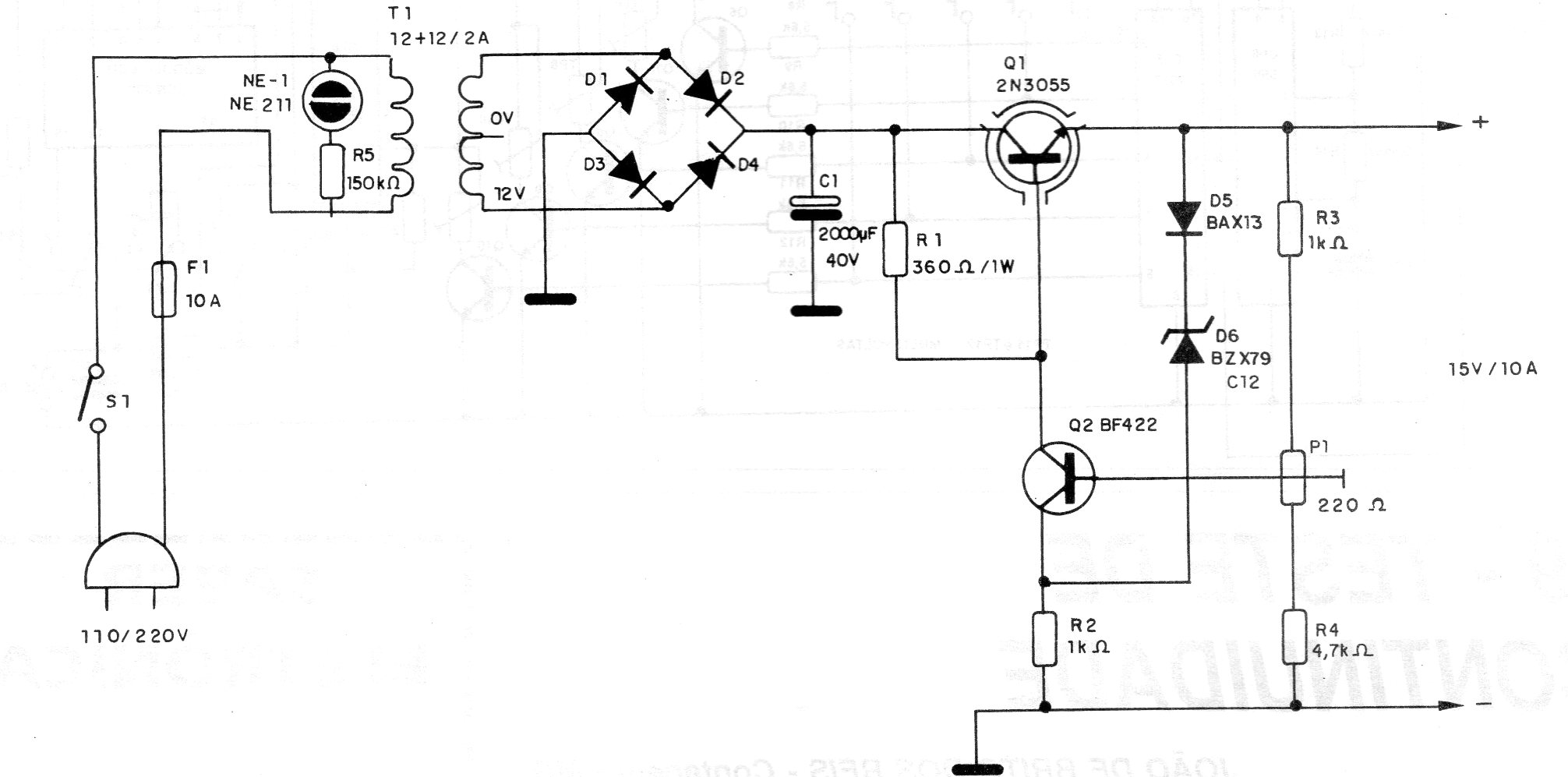 Esta fuente tiene la configuración tradicional de transistor regulador en serie. El 2N3055 usado en el circuito debe estar dotado de un buen disipador de calor. El circuito es bastante simple, pero eficiente que se ha encontrado en una documentación de 1995. Los diodos pueden ser 1N5402 o equivalentes.