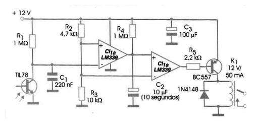 En el circuito de la figura cuando el foto-transistor deja de recibir luz, el relé dispara por un intervalo de tiempo que depende del valor del capacitor C2. La temporización obtenida es de aproximadamente 1 segundo para cada microfarad de capacitancia. Sin embargo, los capacitores de más de 1 000 uF no deben usarse porque sus fugas pueden afectar la estabilidad del circuito. El relé utilizado es de 12 V con bobina de 50 mA y contactos de acuerdo con la carga controlada. También se pueden excitar cargas de mayor potencia con el uso de un Darlington PNP. La fuente de alimentación no necesita ser simétrica y el foto-transistor utilizado como sensor puede ser de cualquier tipo.