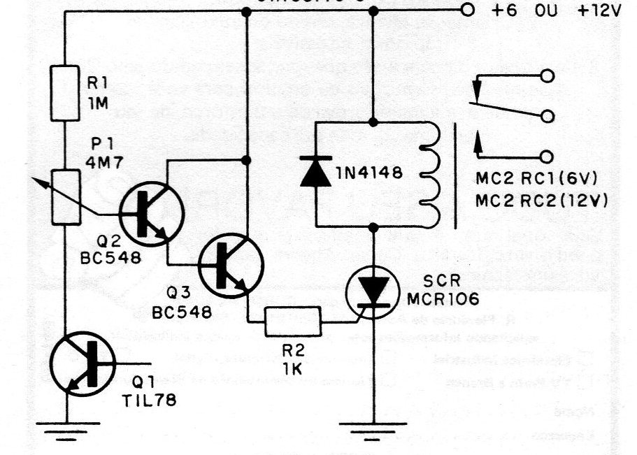Para el disparo con traba tenemos también el circuito mostrado en la figura. En este circuito tenemos también los transistores complementarios que disparan el SCR. El SCR energiza la bobina del relé, manteniéndola en este estado hasta que la corriente se interrumpe. El control de sensibilidad en este circuito también puede ser añadido, constituyéndose en un trimpot de 47 k en serie con el resistor. Para los SCR del tipo TIC106 puede ser necesario conectar, entre el cátodo y la compuerta, un resistor de 1k.
