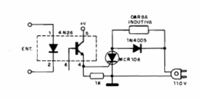 Con el siguiente circuito es posible controlar un SCR como el MCR106 u otro de la serie como el TIC106 a partir de una señal aplicada al 4N26 (acoplador óptico). Se obtiene un excelente aislamiento y el circuito puede controlar cargas de alta corriente. El transistor del aislador debe ser alimentado con tensiones continuas de 6 a 12 V. Véase que un re4sistor limitador de corriente debe ser usado para el LED del 4N26. Su valor depende de la salida usada del microcontrolador, por ejemplo 120 ohms a 3,3 V o 330 ohms a 5 V. El circuito también funciona con 220 V utilizando SCR apropiado. Vea aplicaciones similares en los artículos que tratan de Relés de Estado Sólido, disponibles en el sitio del autor.