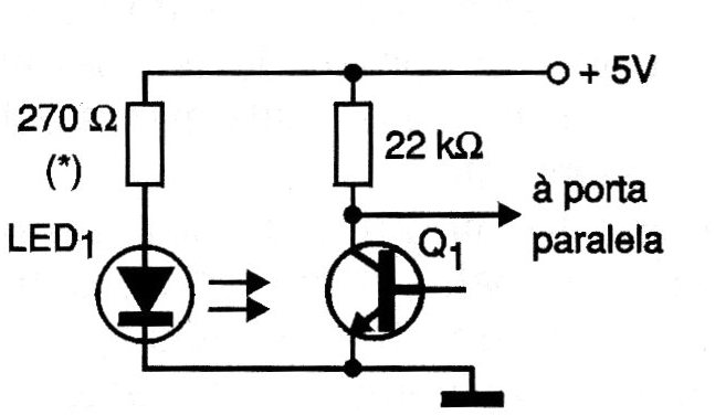 El circuito mostrado se puede utilizar para enviar pulsos de mando desde una rueda dentada u otro sensor colocado entre el LED1 y el foto-transistor Q. El circuito es compatible con las características del puerto paralelo de un PC pero también se puede utilizar como shield para microcontroladores. El resistor marcado con (*) puede eventualmente ser alterado de acuerdo con el nivel de luz necesario para la excitación del foto-transistor. El foto-transistor puede ser de cualquier tipo. Es posible montar 8 unidades similares para obtener un sistema de decodificación óptica (por medio de tarjeta, por ejemplo) para excitar el puerto paralelo del PC.