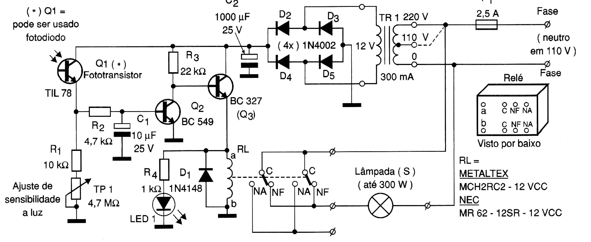 El circuito presentado es de una documentación de 2006. Puede conectar o apagar un conjunto de lámparas cuando la luz incide en el elemento sensor, en el caso de una foto transistor común. El ajuste de la sensibilidad se realiza en TP1. El sensor debe montarse para recibir sólo la luz de la fuente que debe controlar. Por ejemplo, en el caso de un sistema de luz automática, debe montarse dentro de un tubo opaco para recibir sólo la luz ambiental y nunca la luz de las lámparas que controla. El transformador tiene un secundario de 12 V con 300 mA de corriente y el relé utilizado debe tener contactos de acuerdo con la potencia del sistema de lámparas que debe controlarse. Como sensor se puede utilizar prácticamente cualquier foto-transistor común. El propósito de C1 evitar que las transiciones rápidas de luz causan el disparo errático, como en el caso de relámpagos.
