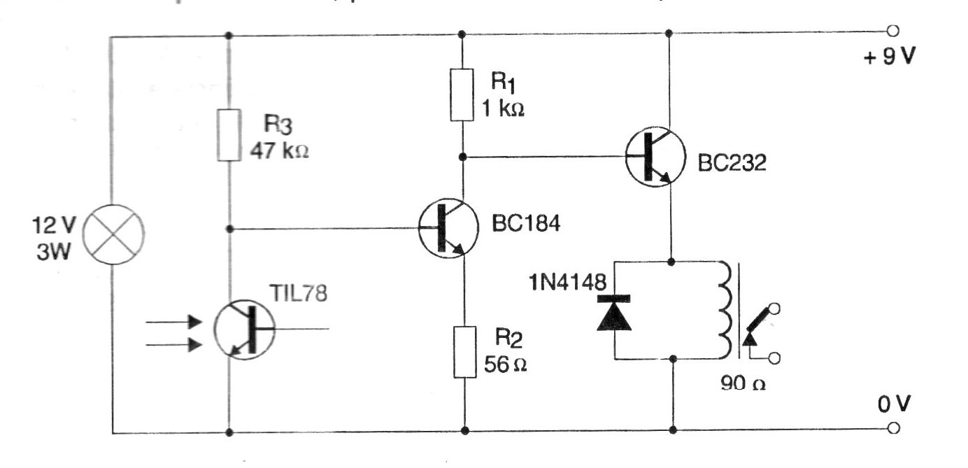 Este circuito es sugerido por Texas Instruments y utiliza dos transistores para excitar un relé de 90 Q. El accionamiento del relé ocurre cuando la luz que incide en el foto-sensor es interrumpida. El relé es de 9 V, pero el circuito puede cambiar para operar con otras tensiones. Observe que la lámpara funciona con un brillo menor de lo normal, ya que se alimenta con sólo 9 V.