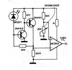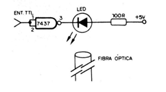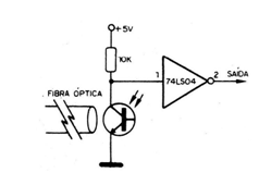 Los datos de una salida serial se pueden transferir a una entrada remota también serial a través de un enlace óptico a través de fibra óptica. En la figura 1 tenemos el transmisor, que utiliza un LED común o infrarrojo adaptado para este propósito o el MFOE1200 de Motorola que alcanza una frecuencia máxima de operación de 100 MHz en el rango infrarrojo y posee envoltura propia para acoplamiento en fibras ópticas. El receptor sugerido se muestra en la figura 2 y utiliza como base un foto-transistor, En especial sugerimos el MFOD71 de la Motoro! A que también posee envoltura propia para acoplamiento en fibra óptica y su sensibilidad es mayor, en torno a 8000 Angstroms. La longitud máxima de cable recomendado para este sensor es de 60 metros, con una corriente de excitación en el transmisor de 100 mA. Para un alcance mayor se puede utilizar como sensor el MFOD73, que admite cables de hasta más de 180 metros, ya que se trata de un Darlington. Un receptor TTL más elaborado para este foto-sensor se muestra en la figura 3. La velocidad máxima admitida para la recepción de datos es de 1 MHz.
