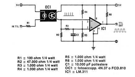 Este circuito salió en una publicación italiana de febrero de 1986. La publicación ya no existe, pero el circuito da una idea de cómo podemos utilizar un acoplador con un transistor para conectar con una entrada TTL. La alimentación debe realizarse con 5 V y la entrada de excitación puede provenir de cualquier circuito lógico. La alimentación debe realizarse con 5 V y se pueden utilizar amplificadores operacionales equivalentes.