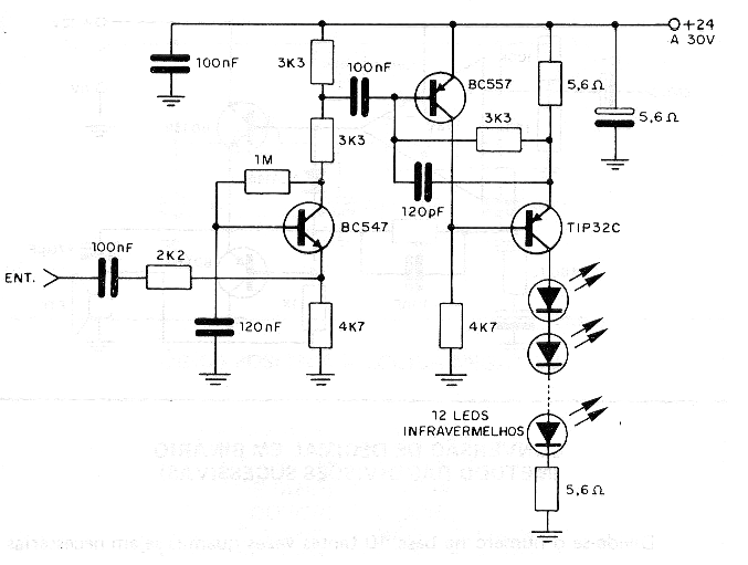 Este circuito consiste en un modulador para transmisión de datos u otro tipo de información hasta 200 kHz, usando hasta 12 LEDs infrarrojos conectados en serie. El circuito debe ser alimentado por tensiones entre 24 V y 30 V y el transistor de potencia necesita ser montado en un buen radiador de calor. Observamos que existen soluciones más modernas que operan con tensiones más bajas para este tipo de circuito, incluso algunas más rápidas.