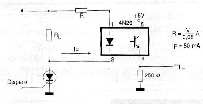 Este acoplador permite el disparo de una puerta o flip-flop TTL a partir de un SCR. La resistencia R debe calcularse mediante la fórmula junto al diagrama en función de la tensión de alimentación del sistema para obtener una corriente en el LED del orden de 50 mA.