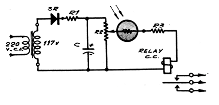 Este circuito, que encontramos en una publicación argentina de los años 1970, utiliza un LDR grande de alta tensión (algunos tipos pueden operar directamente con la tensión de la red). En el caso, se debe utilizar un relé para 110 V. R2 debe ser un potenciómetro de hilo de 22k x 5 W y R1 un resistor de 5k6 x 2 W. El diodo es 1N4004 y R3 tiene valores entre 2k2 y 10k según el relé empleado . Se pueden utilizar relés de tensiones menores, como 48 V, con la elección apropiada de esta resistencia. El secundario del transformador es de 10 mA o más. Para la red de 110 V, el transformador puede omitirse.