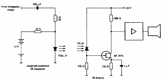 En la figura tenemos el transmisor y el receptor para un enlace óptico de audio a través de infrarrojos. El amplificador puede ser de cualquier tipo y características ópticas como lentes determinan el alcance. El circuito es de un manual de optoelectrónica de Texas Instruments.