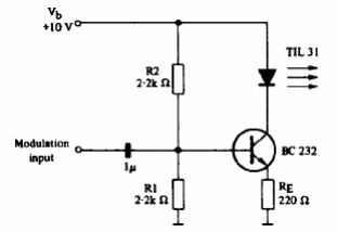 Encontramos este circuito en un manual de optoelectrónica de Texas Instruments. El modulador de audio sirve para enlaces de sonido y el transistor puede ser el BC548. El alcance depende de la sensibilidad del receptor y de los recursos ópticos utilizados.