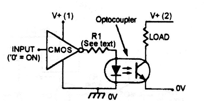 Este circuito muestra cómo conectar un circuito CMOS con un microcontrolador u otro circuito usando un acoplador óptico. La carga (carga) normalmente es un resistor de 1k y la salida del circuito es en el colector del foto-transistor. La alimentación (2) es de 5 V para el caso de microcontroladores y para el CMOS depende de la aplicación. La diferencia con respecto al circuito anterior (CIR11307) es que la salida se activa en el nivel bajo.
