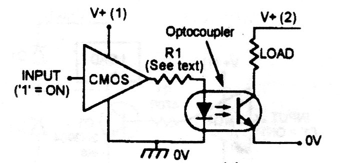 Este circuito muestra cómo conectar un circuito CMOS con un microcontrolador u otro circuito usando un acoplador óptico. La carga (carga) normalmente es un resistor de 1k y la salida del circuito es en el colector del foto-transistor. La alimentación (2) es de 5 V para el caso de microcontroladores y para el CMOS depende de la aplicación.