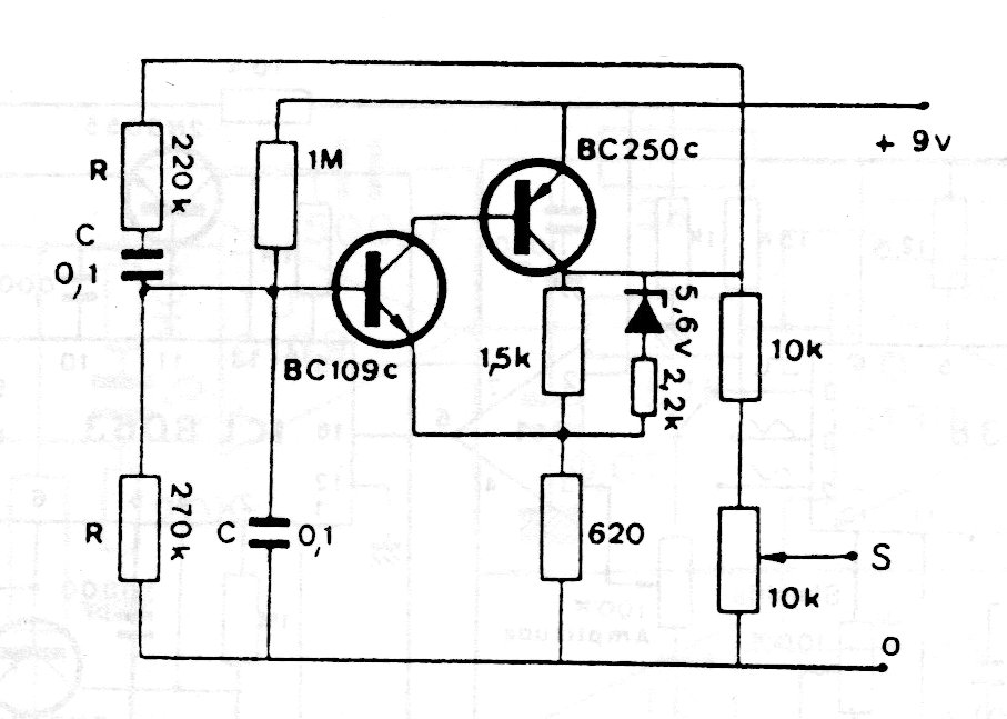 Este oscilador con ajuste de amplitud de la señal genera una señal de 6,5 Hz con los valores de los componentes usados. R y C se pueden cambiar a otras frecuencias. Los transistores pueden ser los BC549 y BC558 y la alimentación puede ser hecha con tensiones de 6 a 12 V típicamente. El circuito es de una documentación de los años 80.