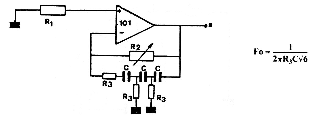 La frecuencia de este oscilador depende de los capacitores y valores típicos para los resistores son de 10 k ohmos. El circuito es de una documentación antigua y tiene la fórmula para la frecuencia dada junto al diagrama. La fuente de alimentación debe ser simétrica de 6 a 12 V según el funcionamiento utilizado.