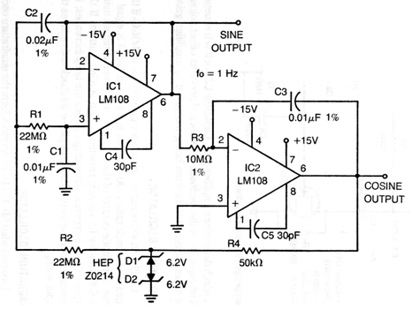 Este circuito, encontrado en una publicación de los años 70, produce una señal senoidal de 1 Hz. Los operacionales son pocos comunes actualmente, pero se pueden utilizar equivalentes más modernos como el 741. El circuito utiliza componentes de precisión en la determinación de la frecuencia, pero si no es necesario, se pueden utilizar componentes con tolerancias comunes. La fuente de alimentación debe ser simétrica.