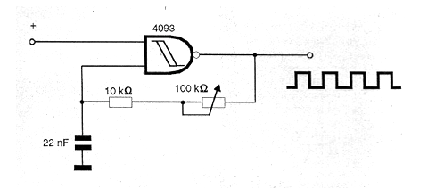 Este oscilador produce una señal rectangular en el rango de 100 Hz a 1 kHz pero con el cambio del condensador, podemos obtener otras bandas de frecuencias. El ajuste fino de la frecuencia se realiza en el potenciómetro de 100 k ohms. En este circuito, sólo se utiliza una de las cuatro puertas del 4093. La alimentación positiva de 3 a 15 V se realiza en el pin 7 y la tierra está en el pin 14.