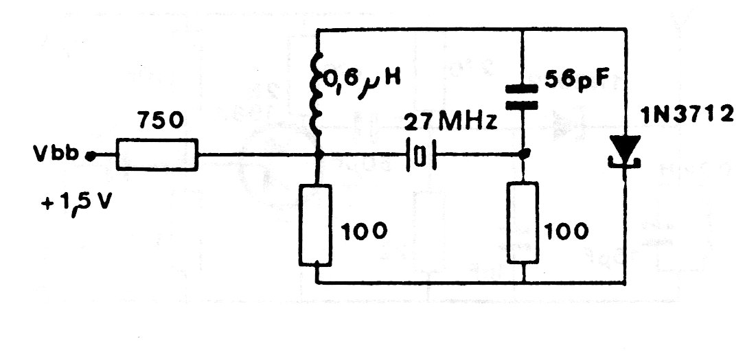 Encontramos este circuito en una antigua publicación sobre diodos túnel. El circuito puede generar señales de hasta algunas decenas de megahertz según el cristal. La polarización del diodo debe ajustarse a valores entre 100 mV y 150 mV.