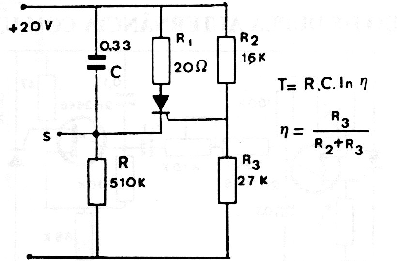 Este es el circuito básico de un oscilador de relajación con transistor programable unijuntura. Las fórmulas están junto al diagrama y la frecuencia máxima es de orden de algunos cientos de quilohertz.