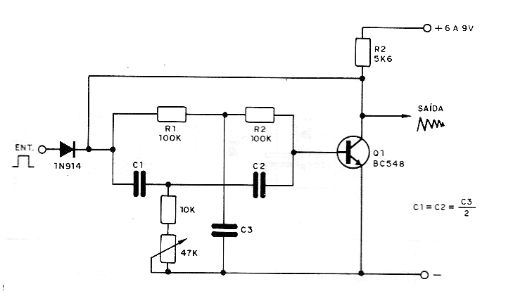Un pulso de entrada excita este oscilador que produce oscilaciones senoidales amortiguadas. La frecuencia es dada por el doble T (Vea en Matemáticas para Electrónica la fórmula para el oscilador de doble T). Los capacitores deben mantener las relaciones de valores del diagrama y el factor de amortiguación se ajusta en el trimpot de 47 k ohms. El circuito puede ser alimentado por tensiones de 6 a 9 V y la señal es de baja intensidad debiendo ser aplicada a la entrada de un amplificador.