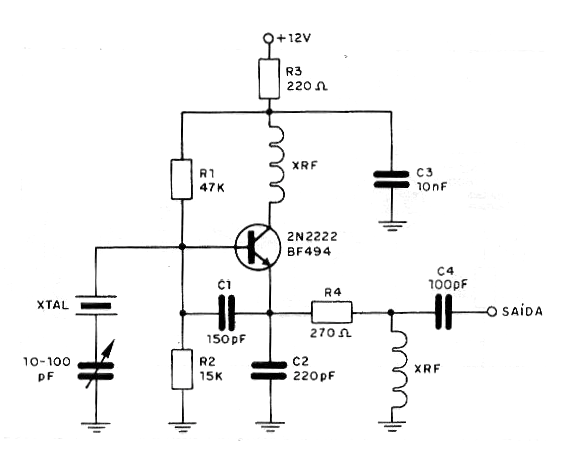 Este oscilador utiliza cristales de 4 a 20 MHz y los choques de RF pueden ser de 1 mH o más, dependiendo de la frecuencia. Los transistores equivalentes se pueden utilizar y la alimentación es de 12 V con una baja corriente de consumo. Los capacitores deben ser todos cerámicos de buena calidad. El trimmer sirve para ajustar el punto de partida del oscilador.