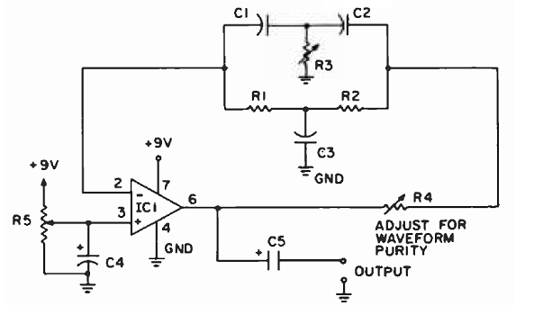 Este oscilador necesita una fuente simple de 9 a 12 V que se ha encontrado en una antigua documentación técnica. Con C1, C2 de 22 nF y C3 de 47 nF la frecuencia estará alrededor de 1 kHz. C4 es de 100 hF y C5 de 10 a 22 uF. R1 y R2 son de 47k o 56 k y R3, R5 de 5k6 o 4k7. R4 es un potenciómetro de 100k.
