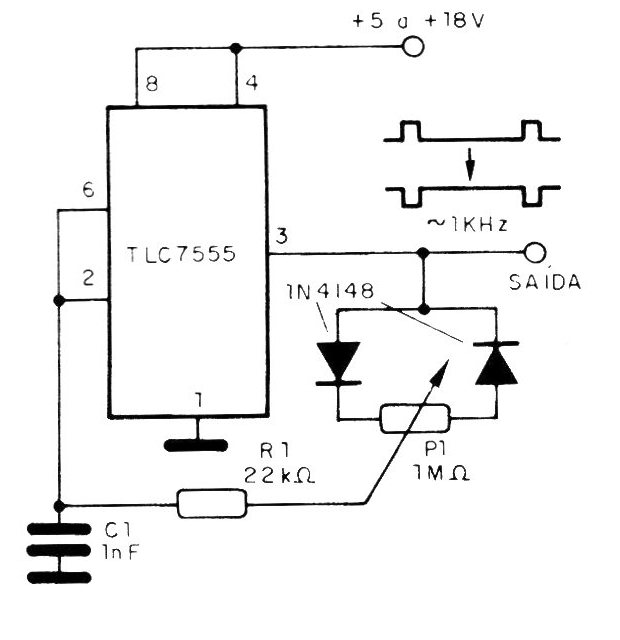 Para conseguir una señal con relación marca / espacio variable en una proporción de 1 a 20 a 20 para 1, tenemos el circuito de la figura. La frecuencia es dada por el capacitor C1 que puede tener valores entre 220 pF y 220 uF. La tensión de alimentación del circuito puede variar entre 5 y 18 V. El trimpot (o pote) P1 ajusta la relación marca / espacio de la señal generada. Hay una pequeña dependencia de la frecuencia de la señal generada cuando se ajusta la relación marca / espacio. El pasador 4 del circuito integrado TLC7555 se puede utilizar para controlar externamente la operación del oscilador. Llevado al nivel bajo, inhibe la operación del astable.