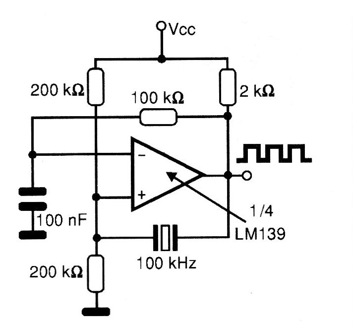 Un cuarto de un comparador de tensión LM139 o equivalente de National Semiconductor, se utiliza en este oscilador que genera una señal rectangular de 100 kHz controlada por un cristal de cuarzo. El circuito necesita una fuente simétrica y los demás componentes no son críticos.
