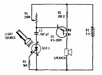 En este circuito un SCR sensible a la luz o Light Activated SCR determina el funcionamiento de un oscilador con transistores unijunción. El unijunción puede ser el 2N2646. El circuito es de una antigua documentación de Radio Shack. LASCR no es un componente común actualmente.