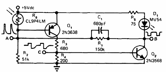 Encontramos este circuito en una documentación de los años 75. Los transistores admite equivalentes como los BC558 y BC548. El LDR es común. El circuito produce pulsos de 5 kHz cuando el LDR está iluminado. El indicador LED puede ser de cualquier tipo. La salida de la señal es rectangular compatible TTL.