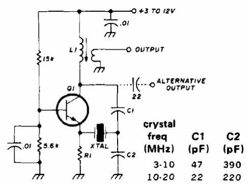Encontramos este oscilador en una publicación para radioaficionados de los años 70. El circuito genera señales según el cristal y R1 puede tener valores entre 1k y 10k. El transistor puede ser el 2N2222 o BF494. La señal es de baja intensidad, sirviendo para excitar etapas de potencia de un transmisor, por ejemplo.