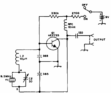 Este circuito se puede sintonizar en un rango de 100 kHz alrededor de la frecuencia del cristal. El transistor puede ser el 2N2222. Encontramos esta configuración en una documentación técnica de los años 70. La potencia de salida es muy baja, pero se pueden utilizar etapas de amplificación en aplicaciones como transmisores.