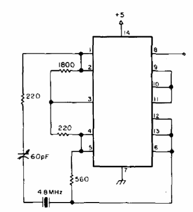 El circuito integrado de esta configuración de 1976 es el 7400 y el cristal del tipo en televisores de la época. El circuito debe ser alimentado con 5 V y la señal generada es rectangular. Observamos que a pesar de ser TLL, la señal de salida por la frecuencia elevada puede no ser perfectamente rectangular. Sin embargo, el circuito es compatible con esta lógica.