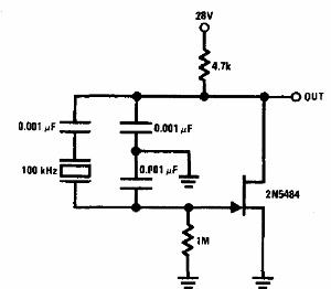Este circuito es del FET Databook del National Semiconductor de 1977. El FET puede ser el BF245 o MPF102 y la frecuencia depende del cristal. Los condensadores deben ser cerámicos. El límite de frecuencia de este circuito está en algunas decenas de megahertz y la corriente consumida es muy baja.
