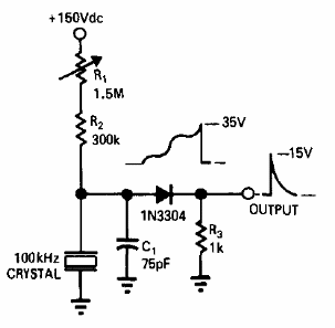 Este oscilador de relajación aprovecha las características de resistencia negativa de un diodo de cuatro capas. No se debe utilizar el equivalente. Observe las formas de onda del circuito. El cristal es de 100 kHz. Los diodos de 4 camadas son tiristores similares a los SCR y transistores unijunción por las características de funcionamiento.