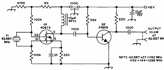 Este circuito fuera de lo común, de una documentación para radioaficionados de los años 70 puede oscilar en otras frecuencias, dependiendo sólo del cristal utilizado. El transistor puede ser el BF494 y cualquier MOSFET de puerta doble puede ser empleado. El límite de frecuencia es del orden de algunas decenas de megahertz dependiendo de los transistores usados.