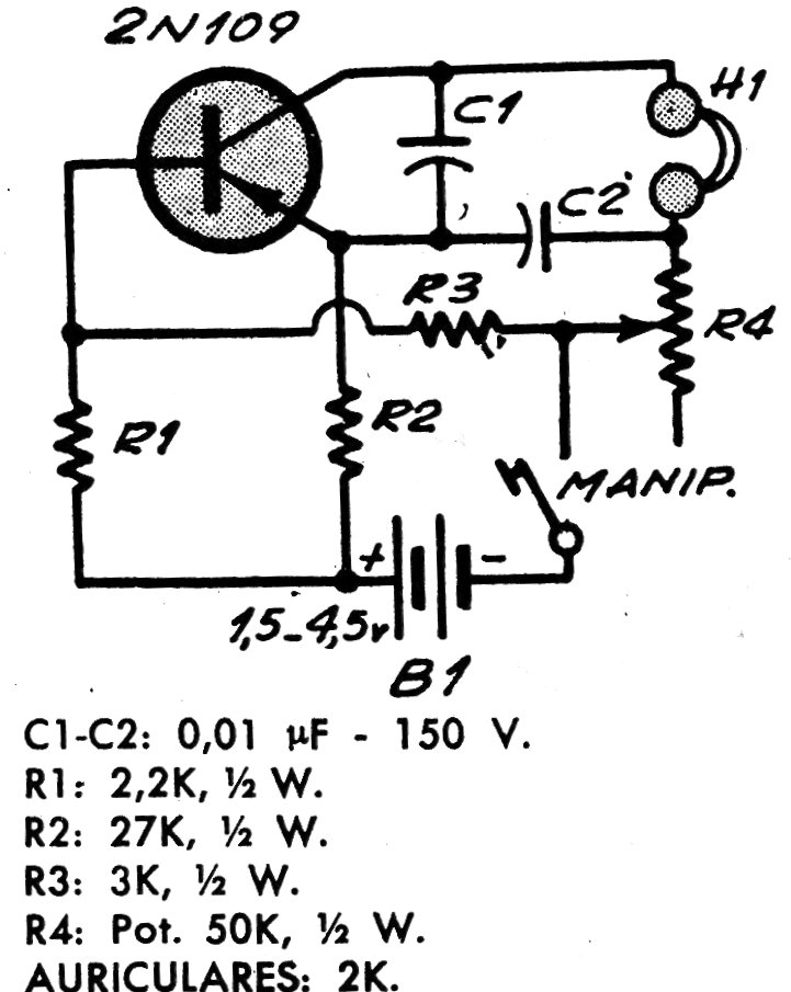 Encontramos este circuito en una publicación argentina de 1973. El transistor original es de germanio y el auricular debe ser obligatoriamente magnético con la impedancia aproximada de 2k. La alimentación se realiza por 1 a 3 pilas comunes conectadas en serie. R4 ajusta la frecuencia.