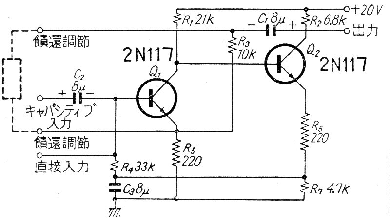 Encontramos este circuito en una documentación japonesa de los años 60. La frecuencia depende del cristal usado. Se pueden utilizar transistores equivalentes modernos y la alimentación debe realizarse con una tensión de 20 V.