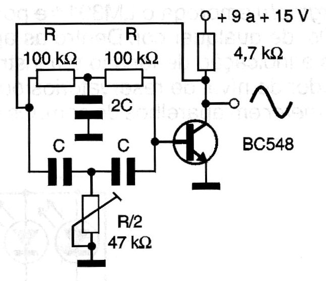 Este oscilador se puede utilizar para generar señales senoidales de menos de 1 Hz hasta cerca de 20 kHz. Es ideal para instrumentos musicales que pueden generar oscilaciones amortiguadas (sonido de percusión). El circuito funciona con tensiones de 6 a 15 V y la frecuencia depende de R y C, que deben mantener las relaciones indicadas en el diagrama. La fórmula para calcular la frecuencia de este oscilador es: