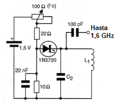 El circuito mostrado en la figura puede generar señales de hasta 1,6 GHz. La bobina L1 y el capacitor C2 se eligen de acuerdo con la frecuencia de la señal que se desea generar. El ajuste del punto de funcionamiento se realiza en un potenciómetro de hilo y la alimentación debe realizarse con una tensión de 1,5 V. Dada la elevada frecuencia de operación a disposición de los componentes en el montaje es extremadamente crítica.