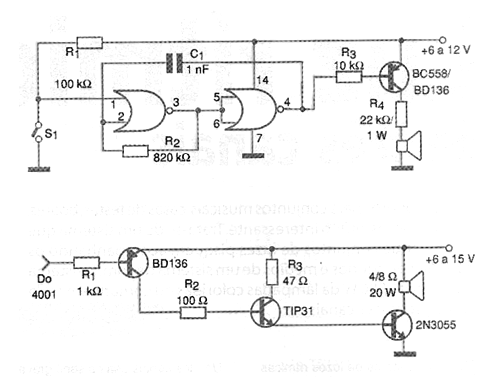 El oscilador mostrado en la figura genera un tono de 1 kHz que se reproduce en el altavoz con buena potencia. Para las alimentaciones hasta 6 V el transistor puede ser el BC558, pero para tensiones mayores, dada la potencia desarrollada se recomienda el BD136 o TIP32, los cuales deben ser montados en radiadores de calor. La frecuencia del circuito puede ser cambiada por el cambio de valores de R2. Se pueden probar valores entre 100 k y 1 M ohms. El condensador C1 también se puede cambiar para que se obtengan tonos de otras frecuencias. Un tweeter piezoeléctrico puede ser usado para generar ultrasonidos en el rango de 18 a 25 kHz con los debidos cambios de R2 y C1. En la misma figura damos una sugerencia de paso de alta potencia para excitar un altavoz con el 2N3055. El transistor 2N3055 debe montarse en un buen radiador de calor y el altavoz debe tener al menos 15 cm con 20 W de potencia.