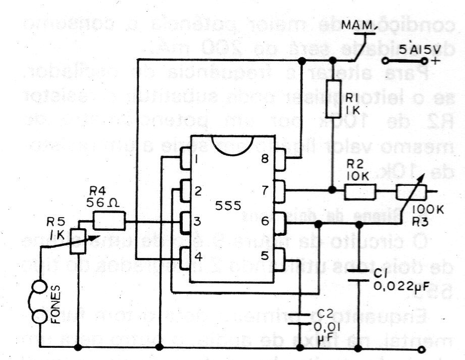 El 555 en la configuración de multivibrador astable se puede utilizar como oscilador para la práctica de código Morse según el diagrama de la figura. El auricular puede ser prácticamente de cualquier tipo, y si el reproductor prefiere puede conectar su salida a un amplificador. El potenciómetro permite controlar la tonalidad de la señal producida. La alimentación entre 5 y 15 V puede realizarse con pilas o fuentes comunes.