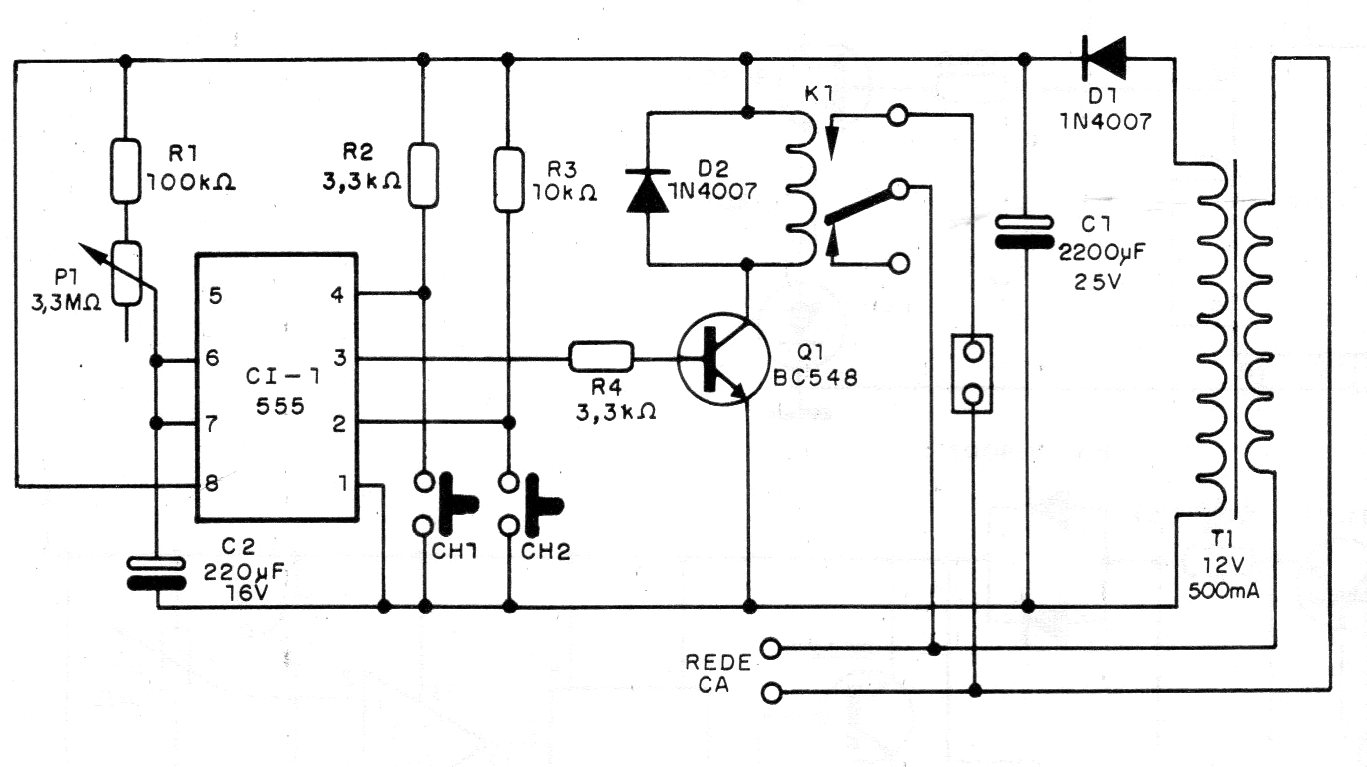 Con un capacitor mayor esta minuteria puede alcanzar tiempo que llegan a 1 hora, por ejemplo, usando un buen condensador de 2 200 uF para C2. Para los valores indicados la temporización es de unos minutos. La carga controlada que se apaga después del tiempo programa o se conecta si los contactos del relé se cambian, depende de la capacidad de los contactos de este relé. El circuito es de una documentación de 1993