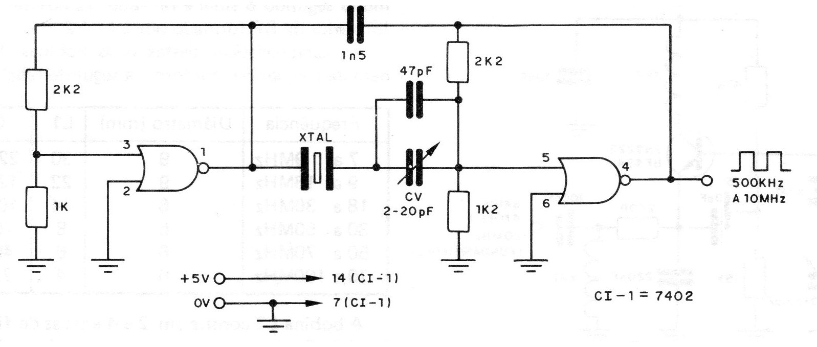 Este circuito difiere de los anteriores por utilizar el 7402, que consiste en 4 puertos NOR de dos entradas. El cristal utilizado también es para la frecuencia fundamental y puede tener frecuencias en los límites indicados de 500 kHz a 10 MHz. El trimmer CV sirve para ajustar el punto de funcionamiento y la salida obtenida es de una señal rectangular. Este oscilador también se puede utilizar para excitar circuitos TT L, como contadores, frecuencímetros, etc. La alimentación debe realizarse con una tensión de 5 V.